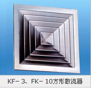 FK-3和FK-10型风口为方形散流器,气流型属贴附(平送)型。适用于播音室、医院、剧场、教室、音乐厅、图书馆、游艺厅、剧场休息室、一般办公室、商店、旅馆、饭店及体育馆等。